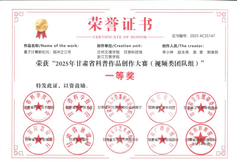 近日,甘肃省科学技术协会公布了2025年甘肃省科普作品创作大赛获奖结果,我校艺术职业学院教师李小琳老师主导创作的科普视频作品——《量子计算新纪元:祖冲之三号》,荣获大赛“视频类团队组一等奖”。