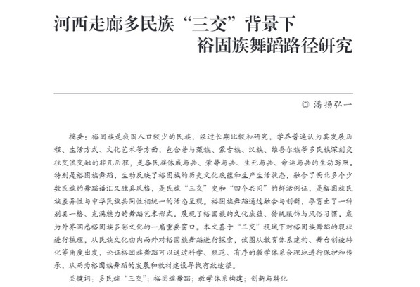 艺术职业学院潘扬弘一老师的论文《河西走廊多民族"三交"背景下裕固族舞蹈路径研究》荣获三等奖。该研究为各民族"交往交流交融"、铸牢中华民族共同体意识提供了有力的理论支撑与实践范例,体现了在民族文化传承与创新领域的研究特色。