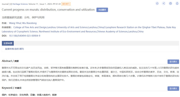 美术与设计学院王亦慧副教授的研究论文《壁画的研究进展:分布,保护和利用》(英文名:Current progress on murals: distribution, conservation and utilization)荣获二等奖。该论文发表于国际主流期刊《Heritage Science》,从全球视角系统分析壁画的分布与保护现状,特别聚焦敦煌壁画的多维价值,为丝绸之路文明互鉴研究提供了重要参考。