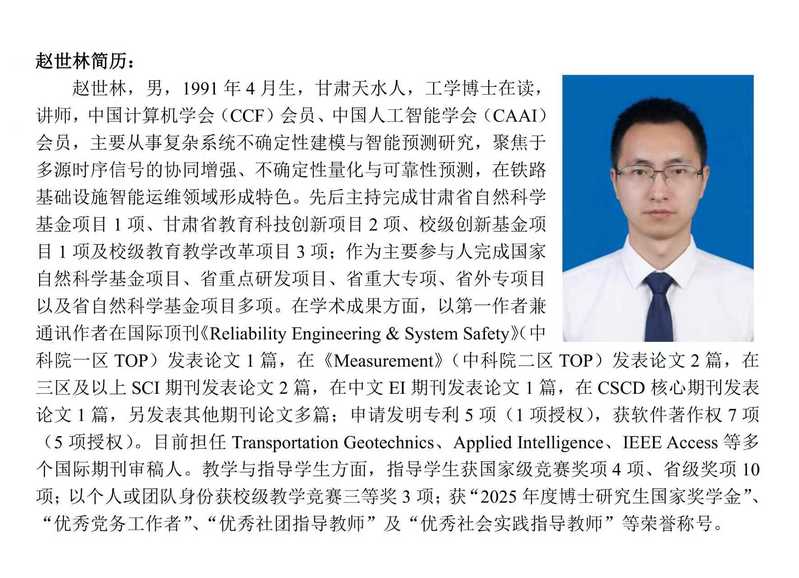 近日,我校数字媒体学院(计算机学院)青年教师赵世林在国际可靠性工程领域顶级期刊《Reliability Engineering & System Safety》(简称RESS)上发表题为《Railway subgrade settlement interval prediction based on collaborative enhancement denoising and bidirectional gated recurrent unit with Monte Carlo Dropout model》的研究成果。该期刊实时影响因子12.2,h指数为119,多年持续入选中国科学院工程技术领域一区TOP期刊,是国际公认的可靠性工程领域权威期刊。